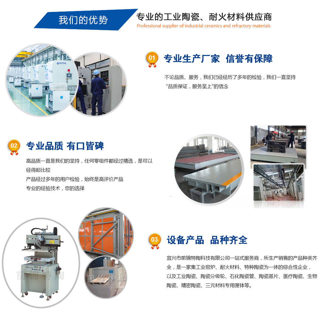 宜興市前錦特陶有限公司作為成員企業(yè)之一,公司主要生產(chǎn)工業(yè)陶瓷、窯具、匣缽、窯爐內(nèi)襯系列。工業(yè)陶瓷以生產(chǎn)氧化鋯陶瓷、氧化鋁陶瓷、碳化硅陶瓷、氮化硅陶瓷等先進(jìn)陶瓷為主;碳化硅制品有碳化硅異形件、三明治板、爐管等系列;耐火高溫窯具為剛玉爐管、剛玉莫來石制品、剛玉推板等產(chǎn)品;以及燒結(jié)墊板、氧化鋁空心球制品、sic板、石墨坩堝、堇青石復(fù)合莫來石板移進(jìn)板、鋯粉、氮化硅陶瓷環(huán)、陶瓷棒、石化陶瓷管、陶瓷基片、磨介、分級輪和氮化硅球閥、熱電偶保護(hù)管、升液管等... ![]() |